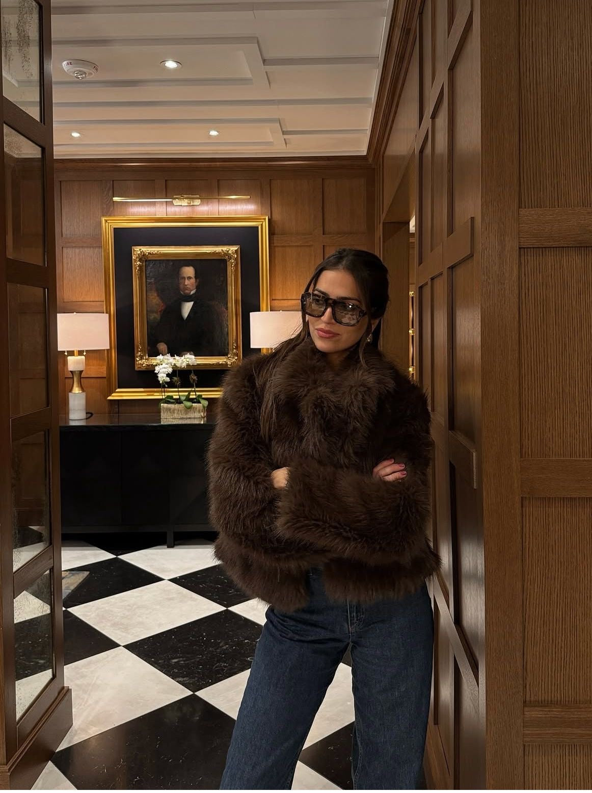 This luxe faux fur jacket brings instant polish to any outfit with its rich chocolate tone and ultra-soft, plush texture. Designed with a relaxed, slightly cropped silhouette and full-length sleeves, it’s the perfect layer for coffee dates, city strolls, or dressed-up evenings. Cozy, chic, and effortlessly elevated — this is the jacket you’ll reach for all season long.