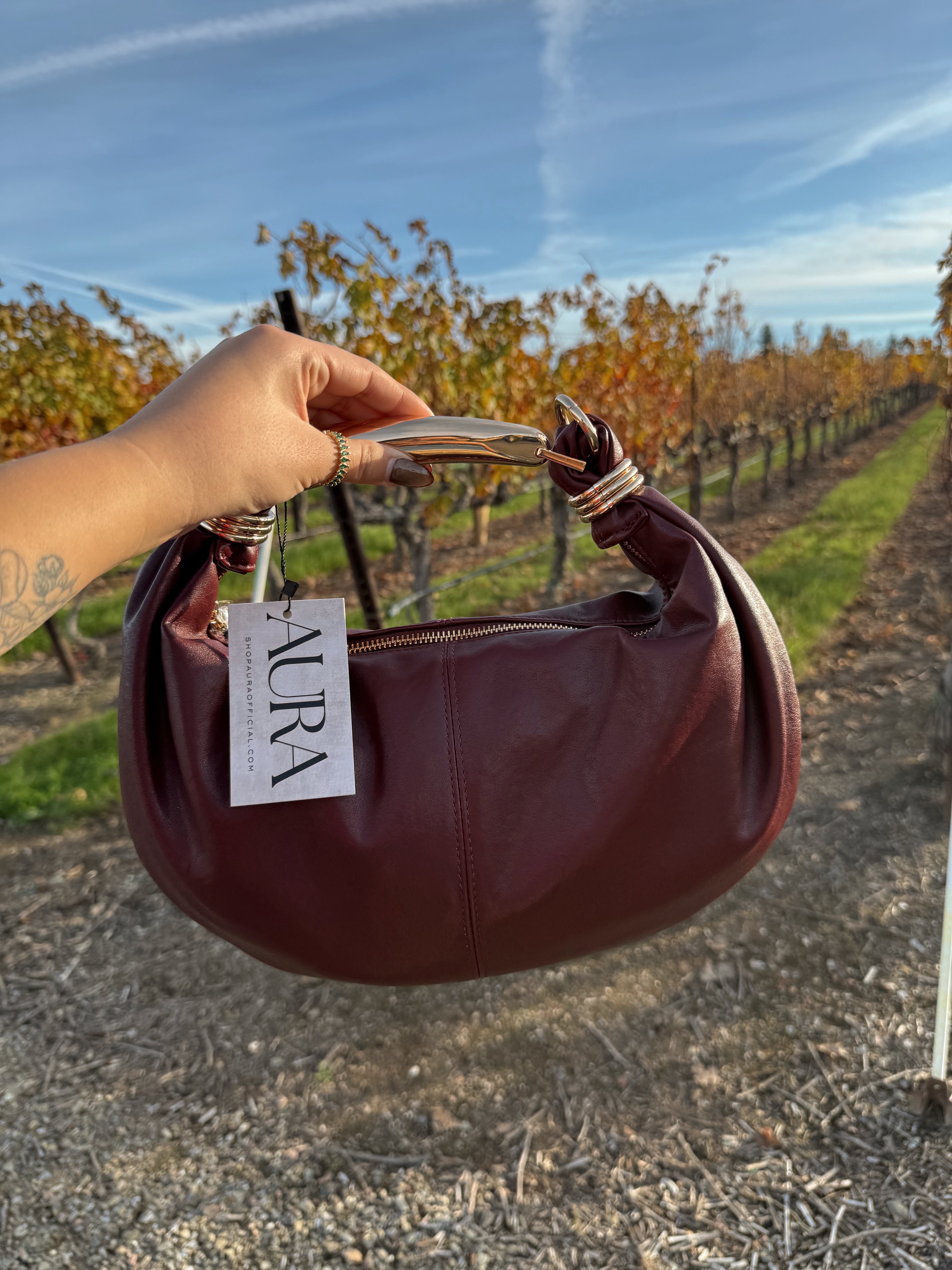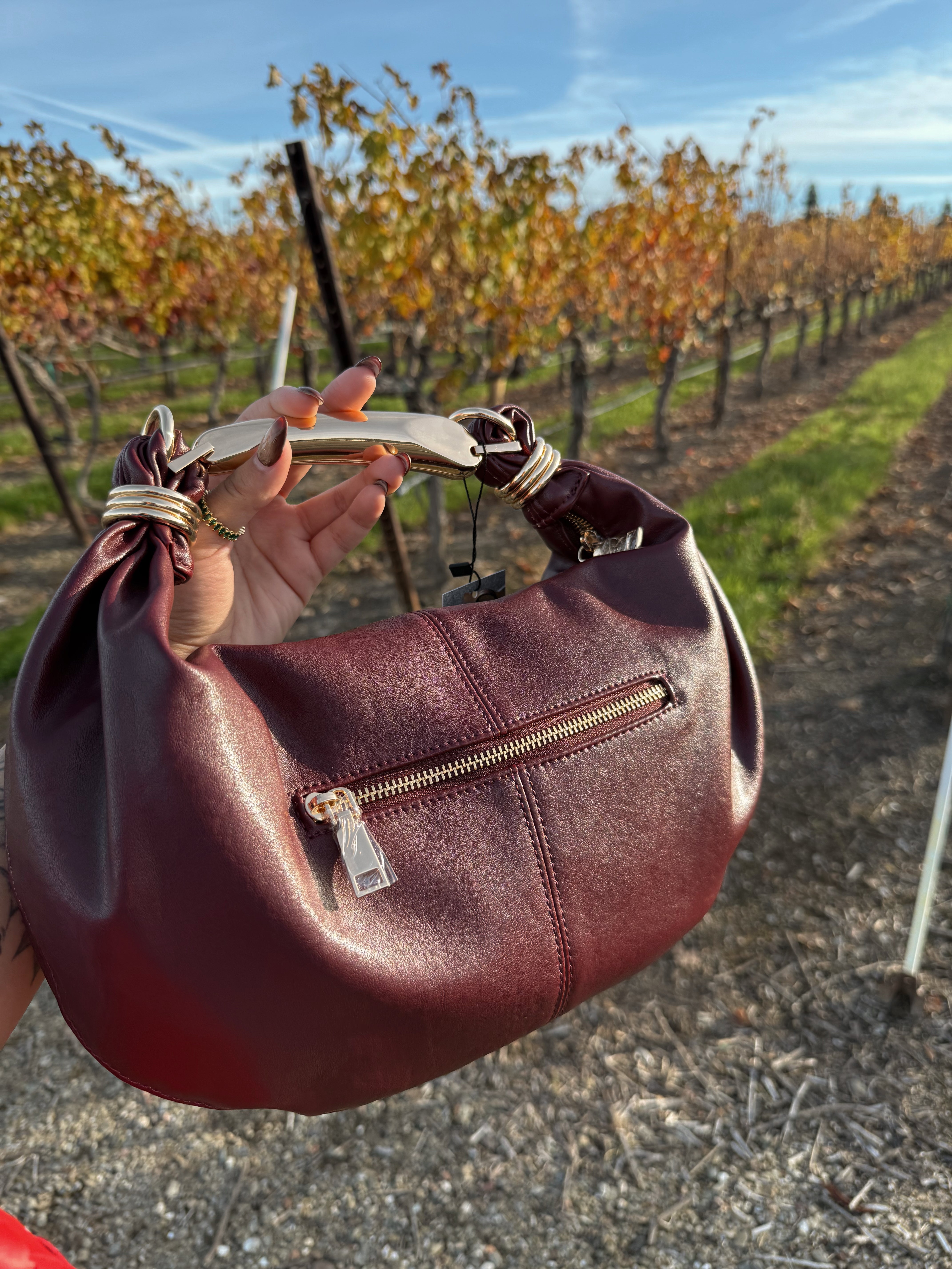 Your new statement accessory. A rich burgundy handbag designed with a soft crescent silhouette, finished with a sleek gold-tone top handle and luxe hardware details. Effortlessly chic and perfect for elevating both everyday looks and night-out outfits.